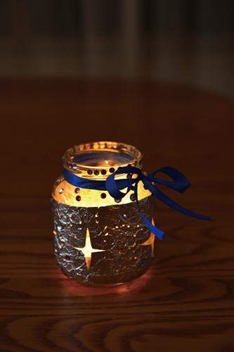 As a finishing touch, glue some beads to the outside of the luminary and tie a bow around the jar.