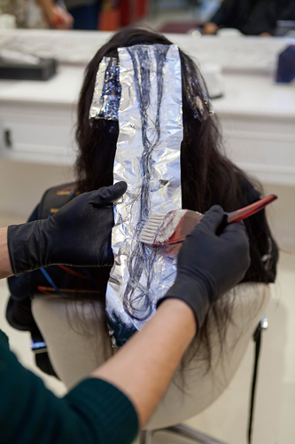 Yuen combined the colors 4-5 and 5-5 from Schwarzkopft Professional’s line to create broad, chocolate brown lowlights for Carvalho.