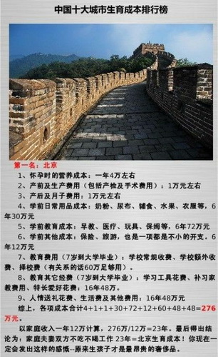 A Weibo entitled “中国十大城市生育成本排行榜” (“Rankings for China’s most expensive cities to raise a child in,” Chinese only) has been sending parents across the country into a panic. Beijing tops the list, with an estimated required investment of around RMB 2.76 million per child from pregnancy to graduation from university. Based on a yearly household income of RMB 120,000, both parents would have to work continuously for over 20 years without food or drink to pay off this amount.