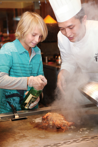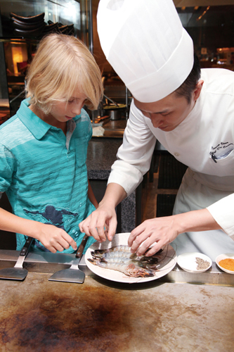 Pre-heat pan to 120°C. Peel and de-vine the king prawns, sprinkling with salt and pepper. For a bit of a kick, add a pinch of cajun spice as well. Squeeze a wedge of lime over the prawns.