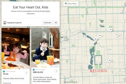 Recently, Pinterest also introduced a Foursquare-powered map function that allows you to visualize the physical location of all the pins on a board. For example, readers can see the placement of each entry on our board for kid-friendly restaurants in Beijing.