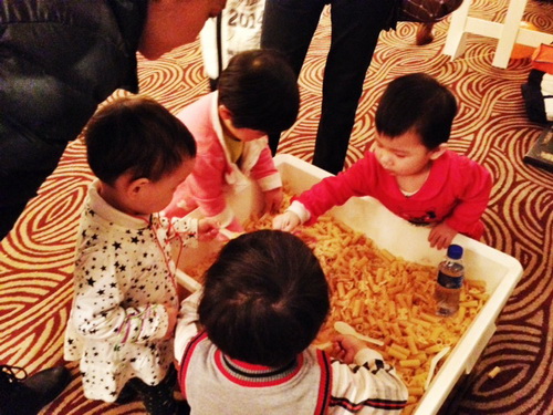When I returned to the play area to fetch my family, Echo was still up to her elbows in pasta and my mother-in-law was sitting peacefully off to one side watching the chaos of kids and parents swirling in and out of the big, loud room. It was time for lunch and I lured my daughter away with promises of cheese (her favourite food) and pasta that she could actually eat (her second favourite food). She left holding my hand, but with her head turned back yelling, “Bye bye pasta!” over and over in a very forlorn voice, like she was leaving an old friend.
