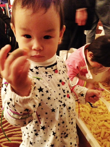 I left my daughter, friend and mother-in-law in the play area that the Ivy Schools were offering to the kids. Cooking classes, bracelet making, and Echo’s personal favourite: playing with pasta. Two wooden bins had been filled with uncooked pasta of various shapes. They provided spoons and containers for the kids so that they could scoop up the noodles and dump them out randomly. She was in heaven. She kept holding up the bowtie pasta and screaming, “Bow! Bow! Mommy! Bow, Bow!” I laughed and said, “Yeah, baby, I see it! It’s shaped like a bow!” (How exciting!)