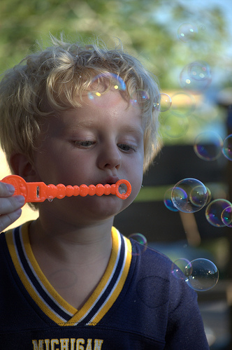 Apparently moms have said that this is a proven trick that children get preoccupied with the blowing of bubbles.