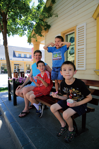 Today is the release date of Transformers: Age of Extinction and the Beeson boys are excited. I catch up with the family in Shunyi at the Beijing Premium Outlet Mall for some ice cream and cold drinks before they head to the movie. The youngest son, Ezra (age 4), points out the Transformers character on my water bottle. “That’s Bumblebee,” he says. “If you don’t know who it is, you should Google it,” he suggests with a happy face. The trio also includes Eli (age 7) and big brother, Zeke (age 9). The three sit down with me for a quick chat about dad and to show off their goofy posing skills.