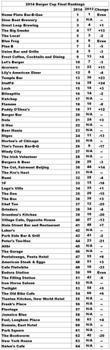 Welcome to the Jungle: Slow Boat tops the list of contestants that didn’t make the cut in last year’s tourney to place in this year’s, coming in at #2. Others that made their debut this year include #17 Katchup; #20 Burger Bar; #22 Q Mex; #23 Beer Mania; #25 Morton’s of Chicago; #27 Windy City; #28 The Irish Volunteer and #31 The Kro’s Nest.