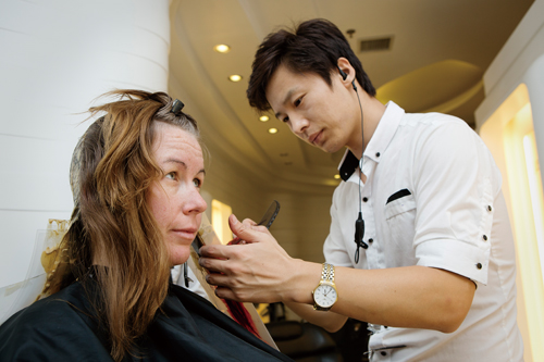 To get on the same page regarding her makeover, Kasha and MyStudio Director Alex An traded ideas and found the perfect inspiration photo on Pinterest. Kasha was open to a dramatic change; she was tired of her light brown hair and side-swept bangs. In the end, she chose heavier straight-cut bangs and a bold chocolate and dip-dyed deep-red combination.