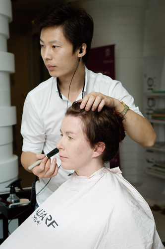 3. For the makeup portion, he started by brushing liquid foundation all over Smith’s face and blended with a dampened sponge. He set the foundation with compact translucent powder, then trimmed Kasha’s brows before filling them in with brown shadow. He lined Kasha’s lashes with moistened black powder and applied a combination of brown and purple eyeshadows, completing her eyes with black mascara. Rather than using blush, An applied a purple shadow to the hollows of Kasha’s cheeks. Finally, he applied a bright coral lipstick, which picked up the tones in her auburn ends.