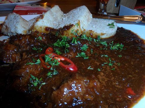 The second night we ate at another vegetarian restaurant called Maitrea. Here I got to enjoy something that I never thought I would, Czech goulash with bread dumplings. While most everything else on the menu was lighter and healthier, like the Thai eggplant Myles and Randy shared, I could not resist a chance to sample a local specialty in a vegetarian option. Czech goulash is much heavier than the version I grew up with, Slovenian style and served over macaroni. And the bread dumplings were so awesomely soaky-uppy (that’s an actual term, right?)