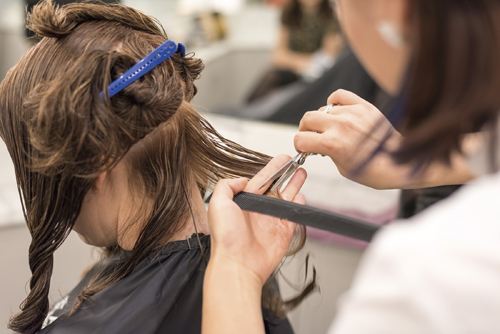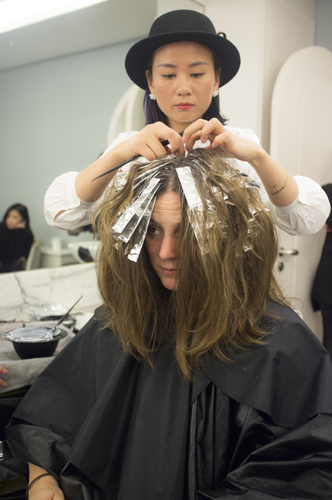 3.Semperio’s hair is rinsed, and her wet hair is smeared with leave-in Kerastase conditioning serum and L’Oreal Mythic Oil. Du slices away the length, layering and feathering to reduce weight, before blow-drying with a barrel brush to produce a sleek and bouncy bob, with more than enough length remaining to make Semperio happy.