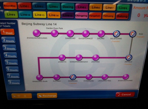 When we descended the steep escalators at the station outside Indigo Mall, we were reminded that the subway system, even the new lines, like most of Beijing, are not stroller friendly. Nor friendly to wheel chairs or people with any kind of walking issues for that matter. Steps leading up to the station entrance so that you can go down into the subway is still the norm. Once inside, the system for purchasing tickets in English was simple enough, though if we didn’t know the name of the station we were going too, it would have been challenging.