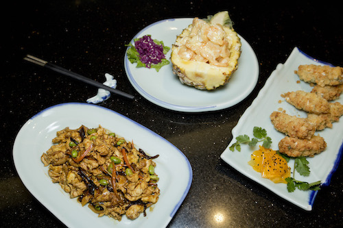 - Sweet-and-sour prawn balls (鲜果沙律虾, xianguo sha lvxia): This blitz of bright tropical island flavors doubles as a main course and a dessert. The tangy prawns are served in a hollowed-out pineapple half and filled with a creamy custardy sauce. Warning: If you don’t like sweet things, stay away from this dish. RMB 118.