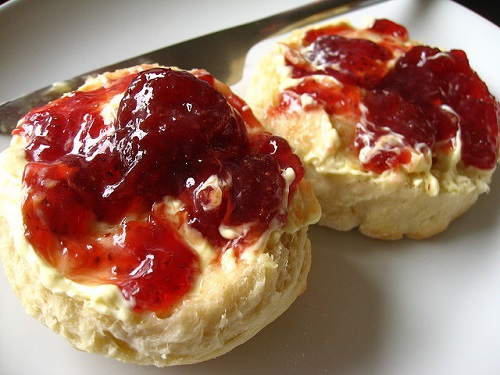 Use a 5cm fluted cutter to stamp out the dough by pushing the cutter straight down into the dough (as opposed to twisting the cutter) then lift it straight out. This ensures that the scones will rise evenly and keep their shape. Gently push the remaining dough together, knead very lightly then re-roll and cut more scones out as before. Arrange the scones on the prepared baking trays and brush the tops with the reserved beaten egg/milk mixture to glaze. Bake for 10-15 minutes or until the scones are well risen and golden. Cool on a wire rack, covered with a clean tea towel to keep them moist. Serve as fresh as possible, cut in half and spread generously with strawberry jam and top with a good spoonful of thick cream.