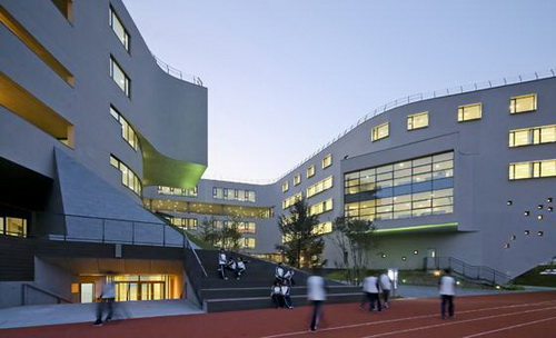 The lower part contains the school’s public areas: the canteen, auditorium, gymnasium, the swimming pool, and even an organic farm with 36 garden plots, whilst the upper part has the classrooms, labs, dormitories, and administrative areas. Although all areas seem like separately shaped entities, they do all connect eventually.