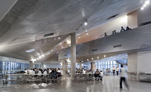 The building itself has a lower and an upper level, the two of which are connected at the middle bit in various ways, to signify the complicated relationship between formal and information education spaces. This also means that interesting spaces and enclosures are created throughout the structure.