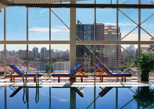 An indoor pool with a view. Located on the 18th floor, and overlooking the Sanlitun embassy area and the northeastern part of the city.