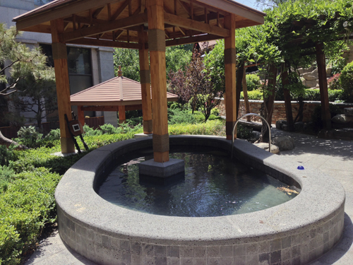 After changing and putting away my stuff away, I’m given a locker wristband and a small re-sealable plastic bag for my mobile phone – priorities, you know. When I descend the two flights of stairs to the hot springs, I’m pleasantly surprised to find a light-filled atrium with high glass ceilings and a carved pastoral scene on the far wall. Below, there’s a large koi pond with tropical greenery growing over the banks.