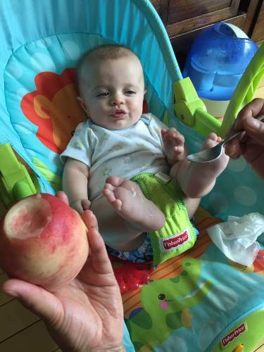 Occasionally other moms will remark that it is too soon to be feeding a baby solid food, but I believe in following my intuition. I know the right thing for my baby and I see the proof in his smiles, his growth, and his diapers. I think that introducing him slowly to solids as we did was the right thing to do for our baby. My advice is to educate and trust yourself. Every child is different, and only you know your baby’s every burp, toot, poop, and facial expression. There never has been and never will be a universal blue print for how to parent correctly. Of course there will be times when we will make mistakes, but “momma knows best.” So have some faith in what you think is right.