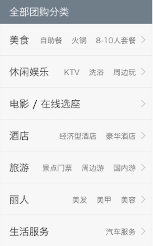This is a list of categories, which are further broken down into subcategories. The main categories include restaurants, entertainment (such as KTV and spas), movies, hotels, travel, beauty services, “lifestyle” services (such as car services), shopping, marriage, and family services (such as family photography).