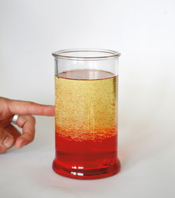 Water and oil are not good friends – they don’t mix. Oil is less dense (meaning lighter) than water, so it floats on top. When the effervescent tablet or bicarb soda drops into the colored water, a chemical reaction begins – producing carbon dioxide bubbles. These bubbles surround droplets of colored water making them momentarily less dense than the oil. They rise up through the oil, until they hit the surface and the bubbles pop. The heavier water then drops back down through the oil to the bottom of the jar. Real lava lamps use two liquids that are very close in density, or weigh about the same, but don’t mix. The heavier liquid down the bottom is heated, which causes it to become less dense and to rise to the top of the lamp. As the heated liquid rises, it cools down, becomes more dense and starts to sink.