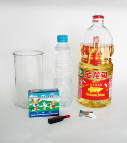 2 Fill your jar two-thirds with oil and slowly pour the colored water into the jar until the liquids are 2cm from the top of the jar.