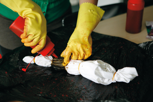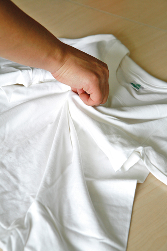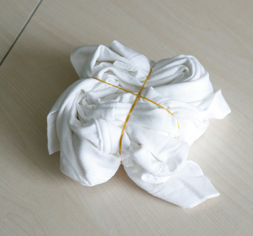 • When dosing the white shirt with color, be sure the dye fills the creases. More is better here; the whites of the shirt should not be visible.