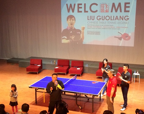 As head coach, Liu led China to a team gold medal and a sweep of individual gold medals at the 2008 and 2012 Olympic Games. He is currently preparing the team for the 2016 Olympic Games in Rio. As part of their distinguished speaker series, Western Academy of Beijing (WAB) invited Liu to share his experiences. An eager audience of 120 students, parents, and staff were there to hear about his achievements, as both a player and coach. The question panel was made up of WAB Grade 10 students Andy Lou and Angela Liu, both members of the school’s table tennis team, WAB parent David Roberts, plus coach and Assistant Activities Director Caleb Liu.