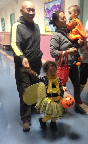 I would have liked to check out the haunted house, but the young man at the entrance with fake blood on his mouth was too scary for my bumblebee. The trick-or-treating down a hallway of classrooms, on the other hand, with the knocking, the yelling of “trick or treat!” and then the costumed respondent giving out free candy – well, my daughter got the hang of that very quickly and was overjoyed to be filling her little plastic pumpkin.
