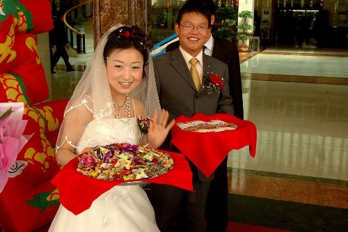 Recently, we were in attendance at my husband’s cousin’s wedding. My daughter was one of the flower girls and my son was the ring bearer – two practices borrowed directly from Western customs. Oh, and there was also a cake that they cut, although it was fake. Fake cake – not so tasty! Besides these components, there was a raised “aisle” down the middle of the hall on which the bride and groom entered on slowly to an eardrum-splintering rendition of “Here Comes the Bride.” …Chinese weddings have a pageantry all their own that is very specific to this culture.