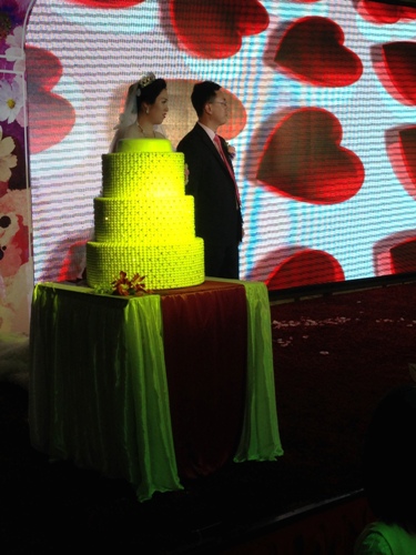 Imagine the final sequence of a romance game show, but with a banquet included. There’s an MC in sparkling attire. There’s entertainment to offset the costume change and then the bride emerges in a new dress. There are prizes on every table: delicious food, expensive liquor, little candy bags. And the huge LED screen behind the stage is an ever-changing backdrop framed by lights, glitter balls, and a strangely robust camera crew filming guests from all angles. Great fun!