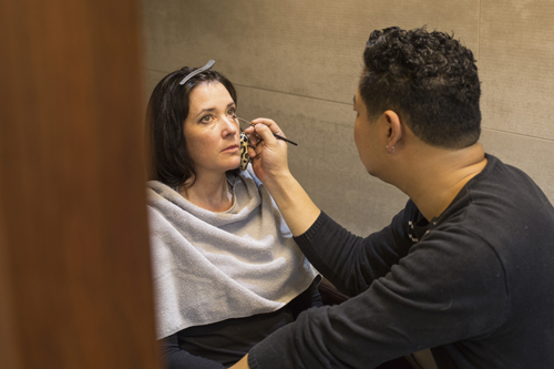 3. Liu brushes on a blend of three shades of foundation to match Gauthier’s skin. “I keep a light touch with product,” he says, “You shouldn’t cover the face, only put it where it needs to go.” He sweeps on translucent powder, before applying a pale silver shade to the inner eye and brown bone. He layers champagne gold, medium brown, and dark brown shadow over the lid, crease, and lash line, lines the eye in black, and finishes with a coat of mascara. He then lines the lips and slicks on a blend of two glosses.