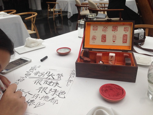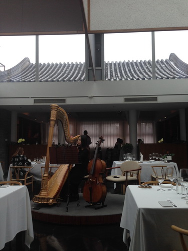 Let’s just start with constant dry ice billowing up from the enclosed courtyard in which the sunken seating was positioned under wide skylights; add the live harp and cello player to the ambiance; factor in the array of flavors and tastes combined in the combo meals; and then, top that with a sophisticated (and charmingly antiquated) feedback system in which they provide you with a piece of paper, a calligraphy pen, and the opportunity to play with stamps as you write out your impressions of their establishment and you have a remarkable dining experience very unlike your average luncheon.