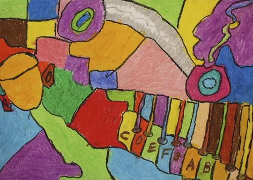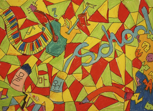 My picture represents a tour around the school from an alien’s perspective. I hope my drawing makes people feel bright and happy.