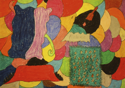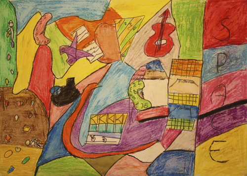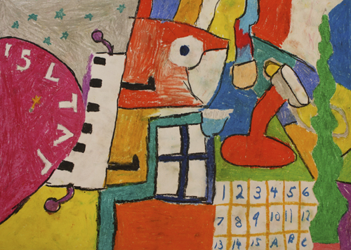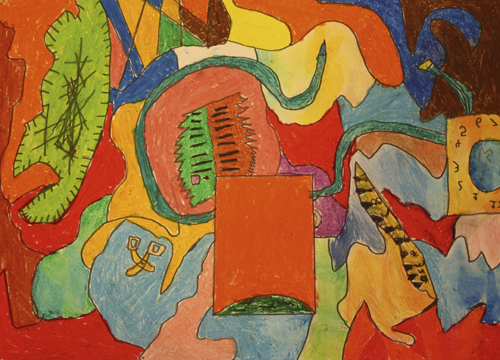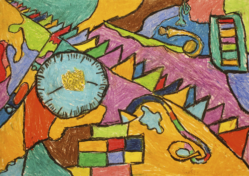 My abstract piece represents the alien’s view of the staffroom. I started by drawing the orange cup with a tiny handle and finished by coloring the many tiles.