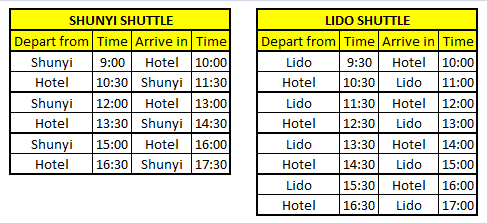 Each shuttle has convenient times for both drop-offs and pick-ups. One of those buses leaves from Shunyi’s Europlaza (欧陆广场) three times a day, while the other departs from Lido Place (丽都广场) four times a day, servicing both of Beijing’s biggest family hubs.