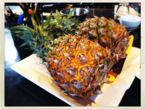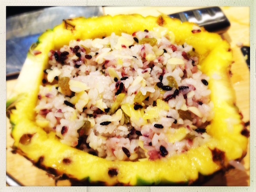 In the interest of time and practicality, the dishes were prepared collectively with different people taking on different tasks. For example, a friend and I were in charge of hollowing out the pineapples while another pair were tasked with marinating the chicken thighs.