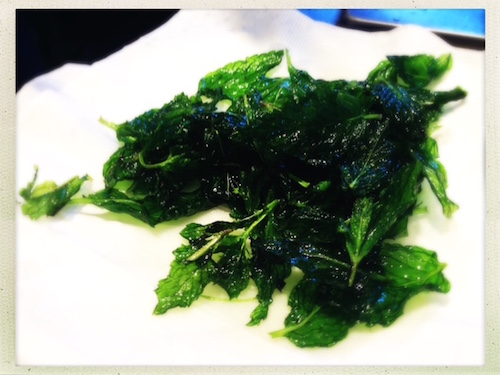 The herbs were left to sizzle and pop for a few seconds, then fished out with a mesh skimmer and left to dry on a paper towel. The result was unexpectedly beautiful, the brilliant green of the leaves a far cry from the sad gray things you usually see at local Yunnan restaurants.