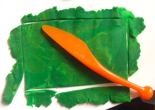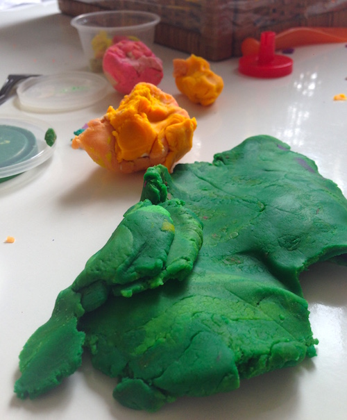 What surprised me was my daughter’s insistence that the dress be two separate colors. She pointed to the orange Playdoh and so we made another square and attached it to the green. When the skirt was finished, she looked at me with a very adult expression that reads: “See? I told you so.”