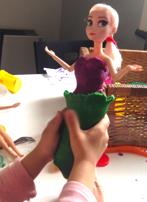 She managed to make some Playdoh stay on the doll’s top half, but the skirt was another struggle. She was trying desperately to attach a thick slab of green Playdoh to no avail.