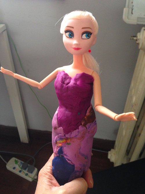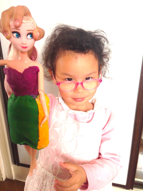 And she was right. It was possible to make clothing out of Playdoh. Who knew? Elsa finally looks a little cooler out of her pale blue ice queen princess uniform. And this mom was happy to spend some constructive time with her little 4-year-old princess.