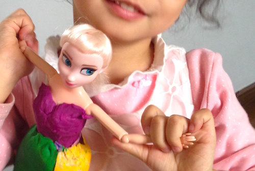 And she was right. It was possible to make clothing out of Playdoh. Who knew? Elsa finally looks a little cooler out of her pale blue ice queen princess uniform. And this mom was happy to spend some constructive time with her little 4-year-old princess.
