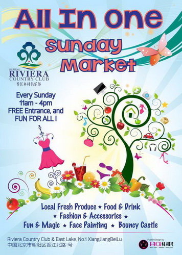 All Ages. The Riviera Sunday Food Market has now blossomed into the All in One Market. Every Sunday they’ll have vendors from all over Beijing, selling everything from