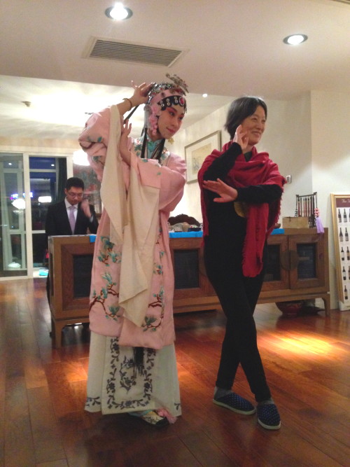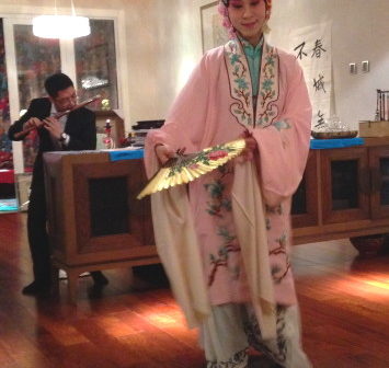 When all were seated, a Chinese flute player came into the room and sat down and started playing an exquisite melody. After a few musical phrases, in walked a Peking opera singer/actor dressed in full costume and extravagant make-up. Stunning. She performed for approximately thirty minutes and then gave the guest of honor (the grandmother) a few tips on opera stances.