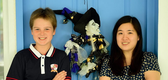 Yoga Yu, Chinese, has been with SIBS for little over two months and has been teaching art for several years at other schools. Yu wanted to make sure families save their money by using materials easily found at home when making this ghoulish wreath. “If you have clothes or fabric that you want to get rid of then this is the best craft to use them for.” She’s teaching this craft to Aleksej Razdolskij, a Grade 5 student from Russia, who is all too happy to cut things up. Razdolskij is helpful, easy-going, cheerful, and more than happy to take photos with everyone.