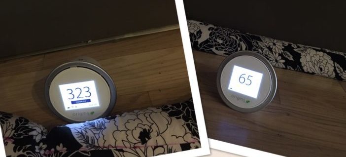 Ever since I got my Laser Egg in 2015, I’ve been a little obsessed with the pollution levels inside my apartment. When we moved to our current apartment over the summer I was thrilled to see that on a “good” day of between 100-200, the Laser Egg would routinely read 4-16 US AQI in all rooms of our apartment. I was not thrilled to see that my living room filters struggled to keep up when it got above 200 outside. After some investigation with the Laser Egg, I found leaks at both patio doors and the main apartment door. We sealed the living room patio door with packing tape, but we need to access the kitchen patio on a regular basis, so sealing it for the winter wasn’t an option. I ended up putting a towel across the threshold to cut down on the pollution. It helped quite a bit. Until today we have been putting a long towel down to block the airflow of the front door, but it gets moved easily and is difficult to fit snugly against the door.