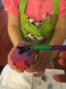 In this craft adventure I made use of an old kitchen towel to prevent paint from spilling onto our table. This craft is better for older kids as you don’t want the paint getting on their hands. My daughter is almost 4 and still rolls naked through paint. The art of textile stamping was a bit lost on her. I, however, found a new pastime and had a blast stamping the fabric.