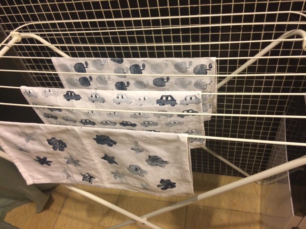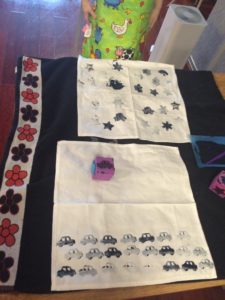 After the stamping phase it is important to iron the fabric (again) to set the paint. We did do that, as I was scared that I would paint the inside of my washing machine. It is best to iron the other side with a cloth in between the iron and the cloth so as to keep the iron paint-free. Afterword, the fabric can be washed and used as napkins or tea towels. These fantastic arts and craft towels or napkins would make make perfect gifts for grandparents