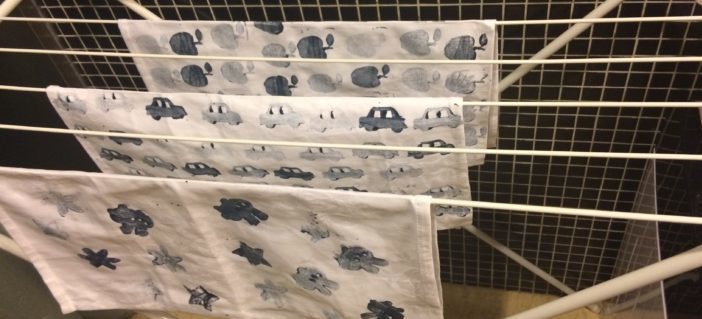 After the stamping phase it is important to iron the fabric (again) to set the paint. We did do that, as I was scared that I would paint the inside of my washing machine. It is best to iron the other side with a cloth in between the iron and the cloth so as to keep the iron paint-free. Afterword, the fabric can be washed and used as napkins or tea towels. These fantastic arts and craft towels or napkins would make make perfect gifts for grandparents