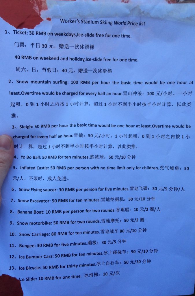 On a sunny Sunday when the air was great. My husband, daughter, and I ventured out to investigate the snow park at workers stadium. I was warned the payment information would all be in Chinese so I was prepared to not understand a thing. We would just pay and see where it would lead us.