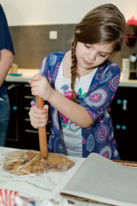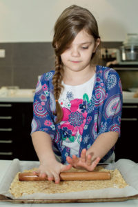 - Press the Rice Krispies crumb mixture into the lined 10×15 baking sheet with a rolling pin. 用擀面杖将融合好的米香混合物铺在带烘焙油纸的烤盘中。